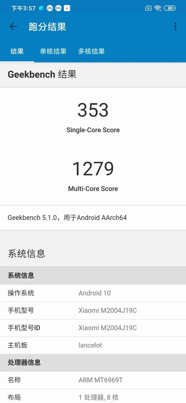联发科G80采用了12nm制程,最高主频为2.0GHz,官方宣称安兔兔跑分超过20万分。我们分别用安兔兔和Geekbench5跑了一下,基本符合宣传。不过G80作为一款入门机的SoC,我们也不好为难它,就简单跑了局王者荣耀(16分钟 特效画质全开,分辨率选择的是高),跑分和帧率记录见以下几张图。
